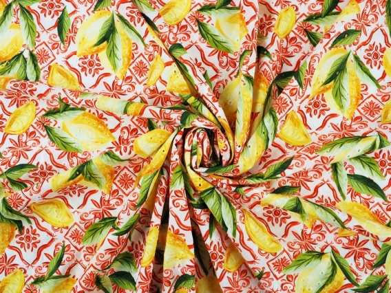 Włoska bawełna ażurowa wyszywana haftem angielskim, określanym także jako Sangallo o wzorze znanym z pokazów włoskiego domu mody Dolce. Na białej bawełnie widoczne są żółte cytryny z zielonymi liśćmi na tle w deseń czerwonych ornamentów - motywie znanym z tradycyjnych, sycylijskich kafli. Całość tworzy gęstą i wyrazistą kompozycję o żywych kolorach, która będzie przyciągać wzrok. Ponadto bawełna pokryta jest wyhaftowanym, kwiatowym wzorem z charakterystycznymi dla ażuru otworkami. Delikatna, naturalna bawełna najwyższej jakości o matowej, niejednorodnej i przyjemnej w dotyku powierzchni. Lekka tkanina, która jest miękka w chwycie. Bawełna ażurowa jest przewiewna i pozwoli skórze oddychać oraz zapewni wysoki komfort noszenia szczególnie w cieplejsze dni. Przy niektórych kreacjach może wymagać podszewki lub mocniejszego umarszczenia. Delikatna bawełna z ażurowym wykończeniem i wyrazistym wzorem, która zachwyci jako modna: