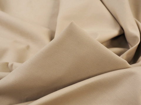 Limitowana edycja włoskiej bawełny elastycznej w jasnym kolorze orzechowym. Materiał premium o jednolitej, gładkiej, miękkiej powierzchni z lekkim połyskiem po prawej stronie. Lewa strona gładka i ładnie wykończona. Plastyczna tkanina z elastanem, który powoduje, że bawełna mniej się gniecie, świetnie pracuje i dobrze się układa. Dzięki temu, że splot tkaniny jest bardzo gęsty bawełna nie wymaga podszewki i nie prześwituje. Materiał dobrze trzymający formę. Bawełna elastyczna, która doskonale sprawdzi się jako: