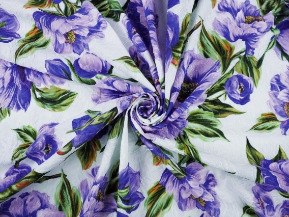 Kolor/wzór: kwiatowy, duży, anemony, indygo, niebiesko-fioletowy, białe tło, haft w kwiaty