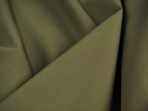 Włoska bawełna w spokojnym, zgaszonym kolorze zielonej oliwki lekko wpadającym w odcień militarnej zieleni. Cienka, naturalna tkanina bawełniana - lekka o zwartej, jednorodnej, matowej i tępej w dotyku powierzchni. Naturalny materiał z gatunku popelina, miękko się układa, ale nie jest zwiewny, oddycha i jest komfortowy w noszeniu. Delikatna bawełna dla osób lubiących klasyczne, spokojne kolory, które łatwo zestawić z formalnymi i codziennymi kreacjami. Będzie doskonałą propozycją na koszulę, ale i bluzkę, tunikę, sukienkę, spódnicę.