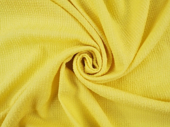 Włoska, luksusowa tkanina typu chanel boucle, z naturalnych surowców: wełny i jedwabiu w nasyconym kolorze jasnym żółtym. Powierzchnia chanelki jest niejednorodna z widocznym splotem charakterystycznym dla projektów żakietów typowych dla domu mody Chanel. Ten strukturalny materiał nie jest gruby, ale zachowuje mięsistość, a jego zwarty splot sprawia, że nie jest specjalnie prześwitujący. To plastyczna, odporna na zagniecenia chanelka wykonana z naturalnych materiałów, które są bardzo komfortowe w noszeniu przez cały rok. Świetnie odprowadza wilgoć i posiada właściwości termoregulacyjne. Włoska tkanina, która doskonale sprawdzi się jako: