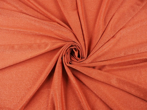 Włoska, elastyczna dzianina wiskozowa w rudym kolorze. Materiał przetykany jest metalicznymi nitkami, które nadają dzianinie blasku i wyrazistego charakteru. Błyszczące drobinki wspaniale łapią światło i podkreślą wyjątkowość kreacji. Fantastyczna propozycja dla fanów powracającej mody retro, która nawiązuje do stylistyki lat 60-tych i 70-tych. Cudowna, miękka dzianina o lekko niejednorodnej strukturze w subletny, poziomy prążek, która jest tępa i przyjemna w dotyku. Cienki i jednocześnie lejący się materiał. Dodatek elastanu sprawia, że dzianina doskonale pracuje i dobrze się układa, dopasowując do sylwetki oraz świetnie sprawdza się w ruchu. Wiskoza jest przyjemna dla skóry i zapewnia wysoki komfort noszenia. Ze względu na przezierność może wymagać podszewki. Wiskozowa dzianina wysokiej jakości, która sprawdzi się jako: