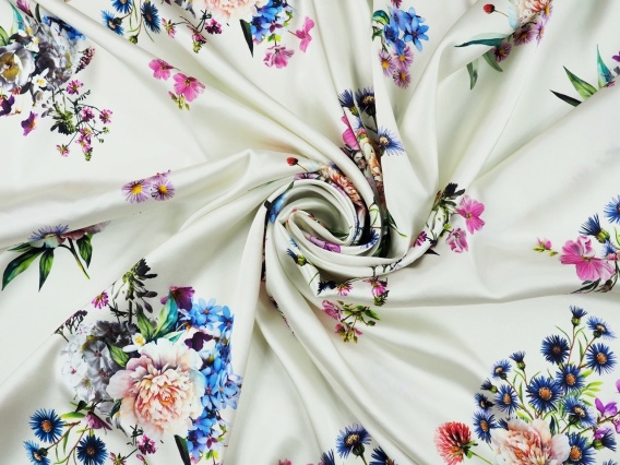 Włoski jedwab elastyczny w kwiatowy wzór. Na białej, perłowej tkaninie wpadającej w śmietanowy widoczne są delikatne bukiety z piwoniami i goździkami w towarzystwie pojedyńczych kwiatów koniczyny. Szlachetny jedwab o zwartym splocie i jednorodnej, satynowej powierzchni - śliskiej, przyjemnie chłodnej w dotyku z eleganckim połyskiem. Lewa strona tkaniny jest matowa, tępa i przyjemna w dotyku. Dzięki dodatkowi elastanu, jedwab doskonale układa się na sylwetce, dobrze pracuje i jest nieco bardziej odporny na zagniecenia. Jedwab elastyczny, który jest miękki w chwycie i lekko lejący oraz miękko się układa. Może wymagać podszewki lub mocniejszego umarszczenia przy niektórych projektach. Najwyższej jakości jedwab z elastanem, który zachwyci jako: