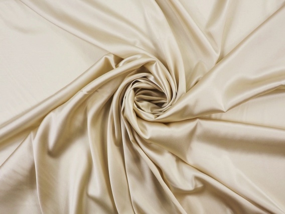 Limitowana edycja włoskich satyn jedwabnych w wyjątkowych barwach. Elastyczny, naturalny materiał jedwabny w interesującym kolorze jasnym szampańskim lekko wpadającym w jasne złoto. Powierzchnia tej luksusowej tkaniny jest satynowana, gładka i przyjemna w dotyku, jego lewa strona jest matowa z ledwo widocznym splotem. Możliwe jest szycie materiału na obydwie strony, co pozwoli wykonać jedwabne kreacje z matowym wykończeniem. Włoska tkanina, która wspaniale się leje i pięknie łapie światło. Dzięki dodatkowi elastanu materiał jest plastyczny, dobrze pracuje oraz jest bardziej odporny na zagniecenia. Wysokogatunkowy jedwab, który doskonale sprawdzi się jako: