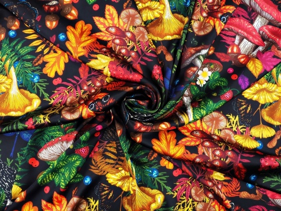 Włoski jedwab elastyczny o kolorowym, roślinnym wzorze. Na czarnej tkaninie widoczna jest gęsta i barwna kompozycja pełna jesiennych motywów m.in. kolorowych liści, grzybów, kasztanów i żołędzi. Ciepłe, nasycone barwy pięknie podkreślają klimat złotej jesieni. Całość tworzy oryginalną, kolorową kompozycję, która z pewnością będzie przyciągać wzrok. Szlachetny jedwab o zwartym splocie i jednorodnej, satynowej powierzchni - śliskiej, przyjemnie chłodnej w dotyku z eleganckim połyskiem. Lewa strona tkaniny jest matowa, tępa i przyjemna w dotyku. Dzięki dodatkowi elastanu, jedwab doskonale układa się na sylwetce, dobrze pracuje i jest nieco bardziej odporny na zagniecenia. Jedwab elastyczny, który jest miękki w chwycie i lekko lejący oraz miękko się układa. Może wymagać podszewki lub mocniejszego umarszczenia przy niektórych projektach. Najwyższej jakości jedwab z elastanem, który zachwyci jako kolorowa: