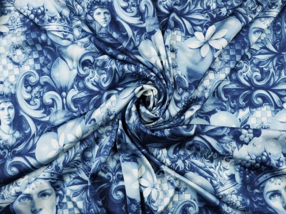 Włoski jedwab elastyczny o bogatym wzorze znanym z pokazów włoskiego domu mody Dolce. Na tkaninie widoczne są motywy zaczerpnięte z sycylijskiego folkloru i charakterystyczne dla kolekcji projektanta. Przewodnim elementem kompozycji są wizerunki kobiety w koronie z owocami - inspirowane tradycyjnymi, sycylijskimi głowami Maurów (testa di Moro) i przedstawione w malarskim, renesansowym stylu. Całość jest bogato zdobiona barokowymi ornamentami, dojrzałymi cytrynami i kwiatami pomarańczy oraz kafelkami w szachownicę. Projekt utrzymany jest w zgaszonym odcieniu niebieskim. Szlachetny jedwab o zwartym splocie i jednorodnej, satynowej powierzchni - śliskiej, gładkiej i przyjemnie chłodnej w dotyku z delikatnym połyskiem. Lewa strona tkaniny jest rozbielona, matowa oraz lekko tępa w dotyku. Dzięki dodatkowi elastanu, jedwab doskonale układa się na sylwetce, dobrze pracuje i jest nieco bardziej odporny na zagniecenia. Jedwab elastyczny, który jest miękki w chwycie i lekko lejący oraz miękko się układa. Może wymagać podszewki lub mocniejszego umarszczenia przy niektórych projektach. Najwyższej jakości jedwab z elastanem, który zachwyci jako przyciągająca wzrok: