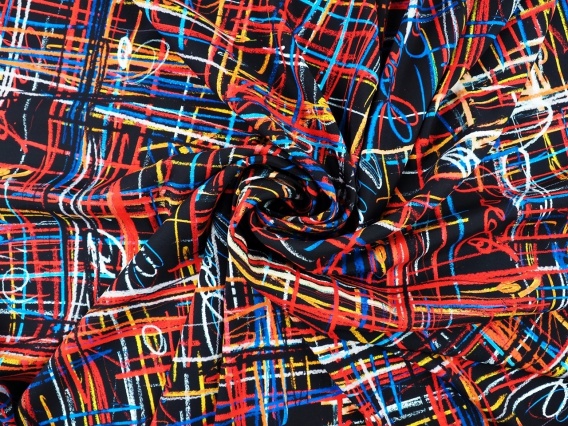 Włoski jedwab elastyczny o kolorowym wzorze znanym z kolekcji francuskiego domu mody Chanel. Na czarnym jedwabiu widoczna jest gęsta kompozycja złożona z kolorowych linii, które tworzą nieregularną kratkę w abstrakcyjnym stylu. Pośród nich możemy zauważyć także napisy. Całość utrzymana w ciepłej i wyrazistej kolorystyce z przewagą czerwieni. Jedwab o zwartym splocie i jednorodnej powierzchni, tępej i przyjemnej w dotyku z półmatowym wykończeniem. Lewa strona tkaniny charakteryzuje się rozbielonym wzorem i jest satynowa - śliska, z połyskiem i przyjemnie chłodna w dotyku. Dzięki dodatkowi elastanu, jedwab doskonale się układa, dobrze pracuje i jest nieco bardziej odporny na zagniecenia. Jedwab elastyczny, który jest miękki w chwycie i lekko lejący oraz miękko się układa. Może wymagać podszewki lub mocniejszego umarszczenia przy niektórych projektach. Najwyższej jakości jedwab z elastanem, który zachwyci jako: