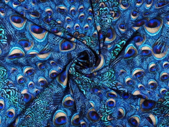 Włoski jedwab elastyczny o ozdobnym, gęstym wzorze w pióra. Na tkaninie widoczne są piękne, pawie pióra oddane z dużą dbałością o detale i utrzymane w intensywnie niebieskiej kolorystyce. Jedwab o zwartym splocie i jednorodnej powierzchni, tępej i przyjemnej w dotyku z półmatowym wykończeniem. Lewa strona tkaniny charakteryzuje się rozbielonym wzorem i jest satynowa - śliska, z połyskiem i przyjemnie chłodna w dotyku. Dzięki dodatkowi elastanu, jedwab doskonale się układa, dobrze pracuje i jest nieco bardziej odporny na zagniecenia. Jedwab elastyczny, który jest miękki w chwycie i lekko lejący oraz miękko się układa. Może wymagać podszewki lub mocniejszego umarszczenia przy niektórych projektach. Najwyższej jakości jedwab z elastanem, który zachwyci jako piękna:
