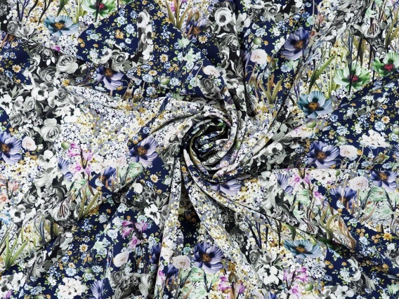 Włoska krepa jedwabna o kwiatowym wzorze. Na granatowej tkaninie widoczny jest wyjątkowo gęsty wzór w drobne kwiaty przywodzący na myśl kwietną łąkę. Lewa strona tkaniny o rozbielonym wzorze. Naturalny jedwab o powierzchni typowej dla krepy - delikatnie niejednorodnej, lekko tępej i przyjemnej w dotyku z wykończeniem w macie. Miękki w chwycie, szlachetny jedwab, który miękko się układa i jest lejący. Dzięki dodatkowi elastanu materiał jest plastyczny, dobrze pracuje oraz jest bardziej odporny na zagniecenia. Doskonałej jakości, nieco grubsza krepa jedwabna, która pozwala skórze oddychać i zapewnia wysoki komfort noszenia. Przy niektórych kreacjach może wymagać podszewki lub mocniejszego umarszczenia. Wspaniały jedwab sprzedawany na metry, który zachwyci jako: