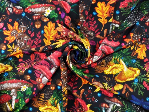 Kolor/wzór: roślinny, kolorowy, wyrazisty, gęsty, grzyby, muchomory, kolorowe liście, żołędzie, szyszki, jarzębina, motyle, poziomki, kasztany, czarne tło
