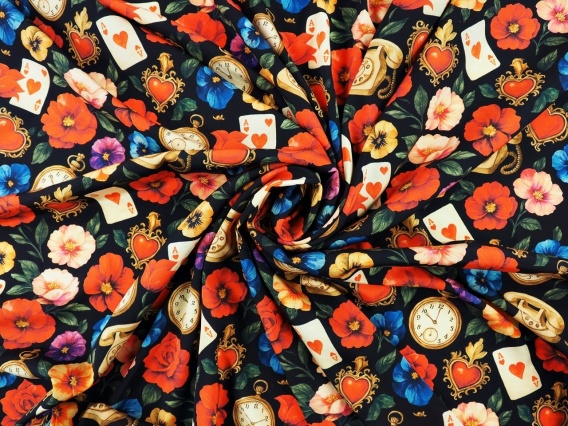 Kolor/wzór: gęsty, bogaty, kwiatowy, kolorowe kwiaty, asy kier, zegarki, telefony, broszki w serca, czarne tło, wyrazisty