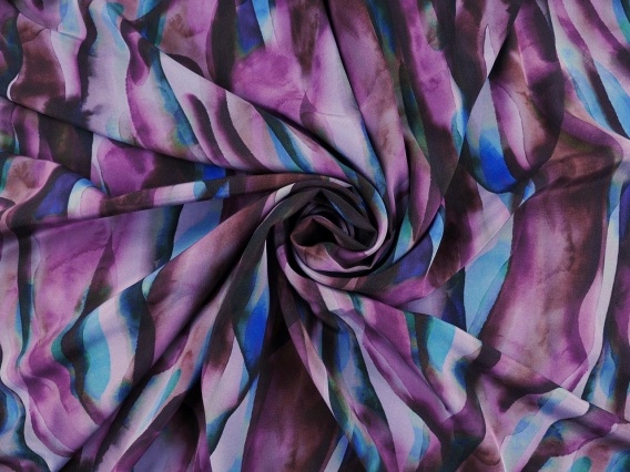 Włoska krepa jedwabna o abstrakcyjnym wzorze. Na tkaninie widoczne są pionowe, abstrakcyjne kształty w akwarelowym stylu utrzymane w ciepłych odcieniach fioletu z niebieskimi akcentami. Powierzchnia jedwabiu jest typowa dla krepy - delikatnie niejednorodna i przyjemna w dotyku. Charakteryzuje się wykończeniem z lekkim połyskiem. Delikatna, cienka tkanina jedwabna, która miękko się układa i jest lekko lejąca. Jedwab naturalny, który zapewni doskonały komfort noszenia. Ze względu na dużą przezierność, może wymagać podszewki lub mocniejszego umarszczenia. Jedwab sprzedawany na metry, który będzie doskonałym wyborem na: