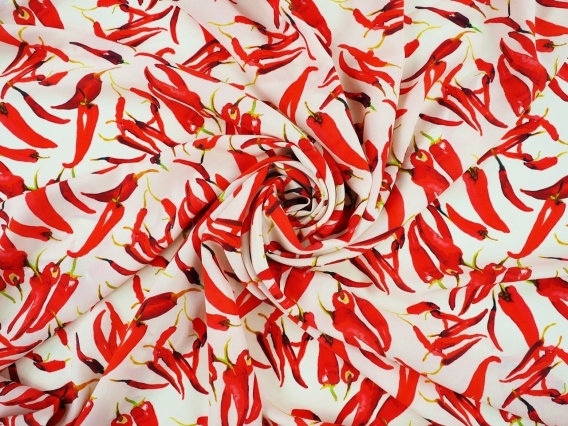 Włoska krepa jedwabna o wyrazistym wzorze. Na białym jedwabiu widoczne są ostre, czerwone papryczki chili. Powierzchnia jedwabiu jest typowa dla krepy - delikatnie niejednorodna i przyjemna w dotyku. Charakteryzuje się wykończeniem z lekkim połyskiem. Delikatna, cienka tkanina jedwabna, która miękko się układa i jest lekko lejąca. Jedwab naturalny, który zapewni doskonały komfort noszenia. Ze względu na dużą przezierność, może wymagać podszewki lub mocniejszego umarszczenia. Jedwab sprzedawany na metry, który będzie doskonałym wyborem na przyciągającą wzrok: