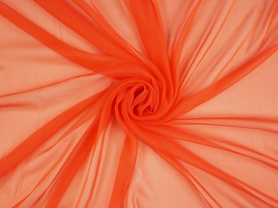 Delikatny szyfon jedwabny w pomarańczwym kolorze w odcieniu soczystej mandarynki z bardzo delikatną, perłową poświatą. Półmatowa tkanina opalizująca, która łapie światło, dając efekt subtelnego połysku. Jedwab o przyjemnej, miękkiej, tępej i chłodnej w dotyku powierzchni. Lekki i zwiewny, przezierny materiał o delikatnym splocie przypominającym mgiełkę - doskonale oddycha i jest niezwykle komfortowy w noszeniu. Z uwagi na typową dla szyfonu przezierność, przy niektórych kreacjach wymaga podszewki lub mocnego umarszczenia. Włoski szyfon najwyższej jakości, doskonały na sukienkę, spódnicę, tunikę, koszulę, bluzkę, pareo, apaszkę, chustę lub elementy wykończeniowe stroju. Efekt opalizacji nadaje tkaninie wyjątkowego, eleganckiego charakteru.
