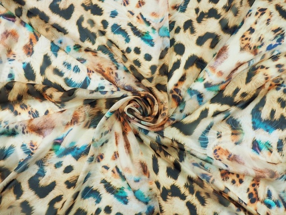 Delikatny szyfon jedwabny w zwierzęcy wzór. Na tkaninie widoczny jest modny wzór w cieniowaną panterkę w przyjemnych odcieniach ciepłego, piaskowego beżu. Dużym cętkom towarzyszą delikatne przedstawienia drapieżnych kotów, o przyciągajcych wzrok intensywnie niebieskich oczach. Naturalny jedwab o niezwykle przyjemnej i delikatnej w dotyku powierzchni z matowym wykończeniem. Lekki i zwiewny, przezierny materiał, który doskonale oddycha i jest niezwykle komfortowy w noszeniu. Ze względu na typową dla szyfonu przezierność, może wymagać podszewki lub mocnego umarszczenia. Włoski szyfon jedwabny najwyższej jakości, który zachwyci jako: