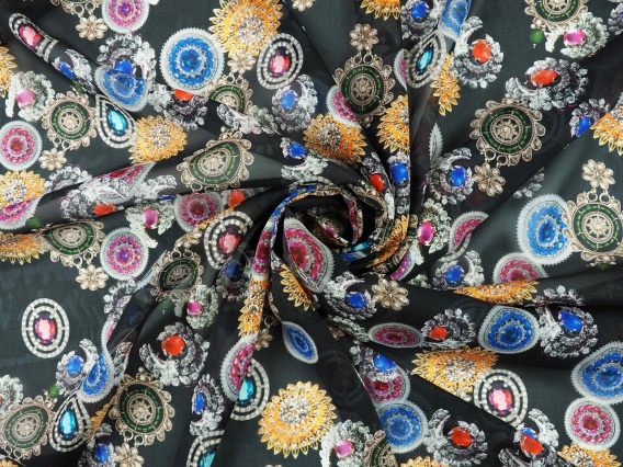Delikatny szyfon jedwabny w biżuteryjny wzór. Na czarnej tkaninie widoczne są gęsto rozmieszczone, ozdobne broszki pełne klejnotów i kamieni szlachetnych, które tworzą bogatą, wyrazistą kompozycję. Szlachetny jedwab o tępej i przyjemnej w dotyku powierzchni utrzymanej w macie. Lekki i zwiewny, przezierny materiał, który doskonale oddycha i jest niezwykle komfortowy w noszeniu. Dzięki dodatkowi elastanu materiał jest plastyczny, dobrze pracuje oraz jest bardziej odporny na zagniecenia. Ze względu na typową dla szyfonu przezierność, może wymagać podszewki lub mocnego umarszczenia. Włoski szyfon jedwabny najwyższej jakości, który zachwyci jako: