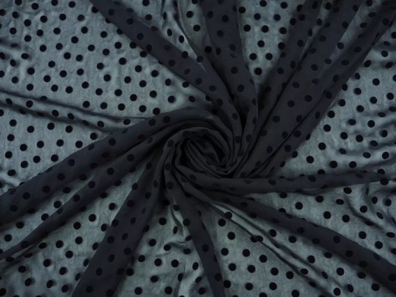 Delikatny szyfon jedwabny o strukturalnym wzorze w groszki. Na czarnej tkaninie widoczne są nieregularne, czarne kropki o średnicy ok. 1 cm o welurowej powierzchni. Wysokiej jakości tkanina strukturalna, lekka i cienka o niejednorodnej, miękkiej i przyjemnej w dotyku powierzchni. Flockowe elementy charakteryzują się szlachetnym, jedwabnym połyskiem, a pozostała część tkaniny pozostaje matowa. Lekki i zwiewny, przezierny szyfon jedwabny, który doskonale oddycha i jest niezwykle komfortowy w noszeniu. Ze względu na typową dla szyfonu przezierność, może wymagać podszewki lub mocnego umarszczenia. Włoski szyfon jedwabny, który zachwyci jako: