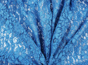 Włoska, bawełniano-wiskozowa koronka typu gipiura w nasyconym kolorze niebieskim w odcieniu błękitnym. Wzór koronki jest wyraźnie roślinny i składa się z równomiernie rozłożonych, regularnych kwiatów oraz liści. Powierzchnia koronki jest niejednorodna nie tylko ze względu na zastosowany motyw, ale również dzięki wykończeniu wykonanego z delikatnie lśniącego, wypukłego sznureczka - metoda ta czyni materiał strukturalnym. Ta naturalna koronka ma jeden brzeg wykończony "brzuszkiem", dzięki czemu ułatwia estetyczne wykończenie projektu. Dosyć lejąca się, ale przy tym niezbyt ciężka, miękka koronka, która sprawdzi się jako: