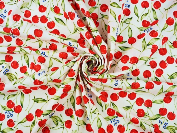 Włoski len z dodatkiem wiskozy i elastanu o owocowym wzorze. Na białej tkaninie widoczne są soczyste wiśnie oraz drobne niezapominajki. Materiał o nieco płóciennym splocie, charakterystycznym dla tkanin lnianych. Matowa powierzchnia i lekko surowy charakter nadają tkaninie rustykalnego charakteru. Tkanina z elastanem, który zapewnia uciągliwość i plastyczność materiału oraz zmniejsza ilość zagniecań. Dzięki zawartości lnu, tkanina jest wyjątkowo wytrzymała oraz posiada doskonałe właściwości termoregulacyjne, gwarantując wysoki komfort noszenia. Wiskoza w składzie nadaje przyjemnej miękkości w dotyku oraz w chwycie, zmniejsza zagniecenia, a także sprawia, że splot jest wyraźnie gęstszy niż w typowych tkaninach z czystego lnu. Przy niektórych projektach może wymagać podszewki lub podklejenia. Elastyczny len z wiskozą doskonale sprawdzi się w kreacjach letnich, a w szczególności jako:
