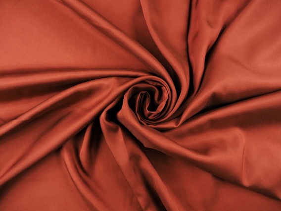 Włoska podszewka elastyczna w kolorze brązowym w rudo-rdzawym odcieniu. Powierzchnia materiału o drobnym splocie diagonalnym z delikatnym, miękkim połyskiem. Podszewka jest lekko tępa i przyjemna w dotyku. Miękka w chwycie, dobrze pracująca i elastyczna tkanina. Jako mieszanka acetatu, wiskozy i elastanu łączy zalety wszystkich surowców - świetnie się układa, jest wytrzymała i ulega mniejszym zagnieceniom, a przy tym jest oddychająca i komfortowa w noszeniu. Uniwersalna podszewka przeznaczona pod: