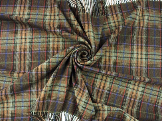 Włoska wełna naturalna w kratę z wykończeniem z frędzlami dedykowana na ciepły szal. Na panelu tkaniny widoczny jest wzór w klasyczną kratę w kolorach ziemi - oliwkowym, brązu, zieleni i ciemnego beżu z niebieskimi i czerwonymi akcentami. Dwie krawędzie materiału wykończone są frędzlami o długości ok. 10 cm. Kryjąca tkanina naturalna o matowej powierzchni z widocznym, skośnym splotem oraz wyczuwalnym, krótkim włosku. Splot diagonalny nadaje wełnie wytrzymałości, delikatnej sprężystości oraz zwiększa jej odporność na zagniecenia. Lekko mięsista tkanina, która jest przyjemnie ciepła w dotyku, miękka w chwycie, lekko lejąca oraz miękko się układa. Naturalna wełna gwarantuje komfort noszenia oraz zapewni przyjemne ciepło w chłodne dni. Przy niektórych projektach może wymagać podszewki. Doskonała propozycja dla osób, które szukają klasycznych wzorów oraz naturalnych tkanin wysokiej jakości. Ciepła tkanina wełniana, która będzie doskonałym wyborem na: