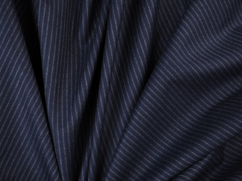 Włoska, luksusowa wełna naturalna z dodatkiem jedwabiu o gładkiej i przyjemnej powierzchni z ledwo wyczuwalnym pod palcami meszkiem. Granatowa tkanina premium o skrętności S120' we wzór w klasyczny, gęsty prążek. Materiał ten zaliczany jest do flanel. Wełniany materiał pochodzi z renomowanej tkalni Vitale Barberis Canonico, której początki działalności sięgają XVII wieku. Zwarta, lekka, wiotka tkanina naturalna, która jest bardzo przyjemna w dotyku, a dodatek jedwabiu dodaje jej delikatnego półmatowego połysku. Należy do wełen garniturowych oraz garsonkowych i właśnie na tego typu kreacje najlepiej się nadaje, oprócz tego świetnie sprawdzi się przy takich kreacjach jak sukienka, spódnica, spodnie i grubsze koszule.