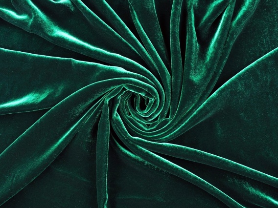 Włoski welur wykonany ze szlachetnego połączenia wiskozy i jedwabiu w głębokim kolorze zielonym w odcieniu szmaragdowym wpadającym w butelkowy. Materiał o miękkiej, niezwykle przyjemnej w dotyku, pluszowej powierzchni z krótkim włosiem przypominającej meszek, charakterystycznej dla welurowych tkanin. Welur jest zwarty, mięsisty i lejący o eleganckim, jedwabistym połysku, który pięknie załamuje światło. Najwyższej jakości materiał doskonały na: