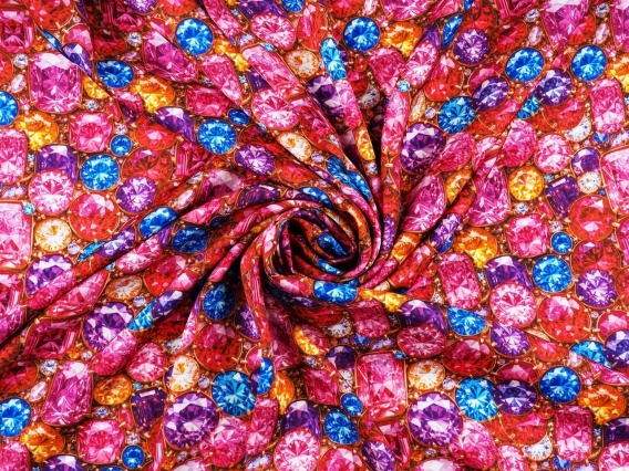 Włoska wiskoza jak jedwab o bogatym, biżuteryjnym wzorze w ciepłych, nasyconych barwach. Na tkaninie widoczne są gęsto rozmieszczone, piękne klejnoty, które tworzą niezwykle ozdobną i wyrazistą kompozycję. Przeważają barwy różu, fioletu i czerwieni przełamane niebieskimi akcentami. Lewa strona o rozbielonym wzorze. Wiskoza o zwartym splocie i jednorodnej, gładkiej, śliskiej oraz przyjemnej i chłodnej w dotyku, satynowej powierzchni. Tkanina wiskozowa z wykończeniem o miękkim połysku. Lekko lejąca się wiskoza, która miękko się układa, a w chwycie przypomina jedwab. Oddychająca wiskoza, która zapewnia komfort noszenia. Może wymagać podszewki lub mocnego umarszczenia. Wysokiej jakości wzorzysta, satynowa wiskoza jak jedwab, która zachwyci jako: