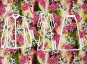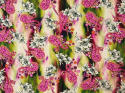 Włoska krepa wiskozowa o orientalnym wzorze. Na tkaninie widoczne są białe kwiaty w towarzystwie paisleyów w kolorze zgaszonego różu. W tle rozmyte są odcienie oliwkowej zieleni z różowymi i fioletowymi akcentami. Lewa strona tkaniny jest rozbielona. Cienka wiskoza o przyjemnej w dotyku powierzchni z półmatowym wykończeniem i nieco niejednorodnym, supełkowym oraz zwartym splocie charakterystycznym dla krepy. Tkanina, która jest miękka w chwycie, miękko się układa oraz jest lekko lejąca. Może wymagać podszewki lub mocnego umarszczenia. Wysokiej jakości wiskoza, która będzie zachwycać jako: